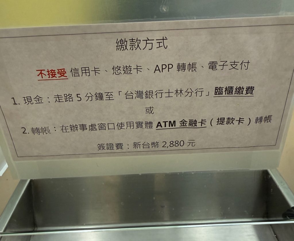 • 若無提款卡,需至鄰近台灣銀行繳費後再返回,來回大概要 10-15 分鐘,較為耗時。