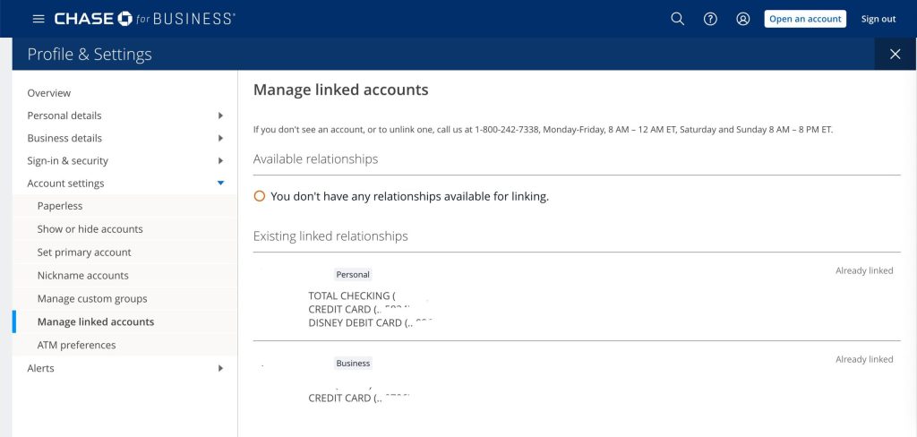 可以在登入 Chase 商業帳戶的左上角選單依序點選:「Profile & Settings」-> 「Manage linked accounts」看到如下畫面: