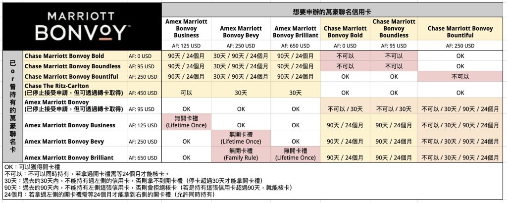 - 美國運通 (Amex): 發行兩張個人卡 (高階的 Brilliant、中階的 Bevy),一張僅能透過降級取得的低年費個人卡 (Marriott Bonvoy),以及唯一的一張萬豪商業卡 (Business)。